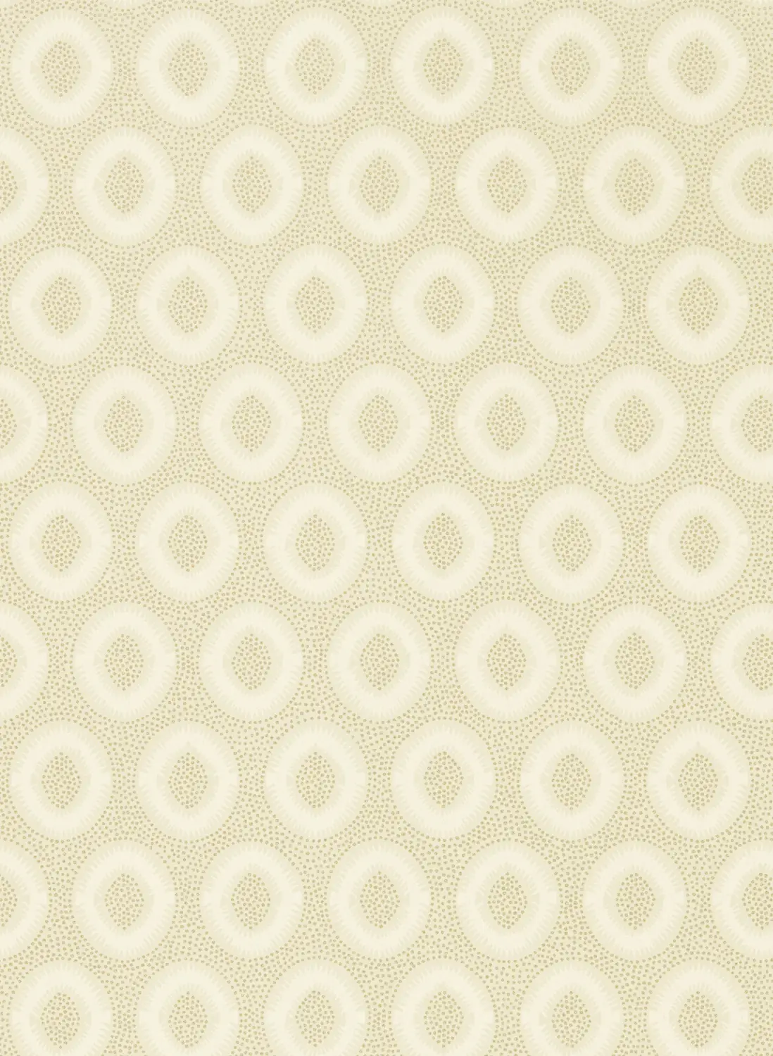 Die Tapete zeigt ein gleichmäßiges, textilähnliches Muster mit sanften Kreisformen, die eine Tiefe erzeugen. Sie bringt Leichtigkeit und Eleganz an die Wand und harmoniert besonders gut mit modernen, hellen Raumkonzepten.