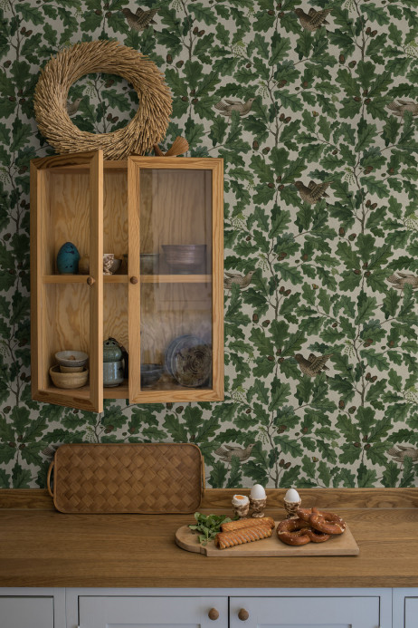 The wallpaper features an exquisite Scandinavian pattern of elegant oak leaves created by designer Sissa Sundling. Birds and insects populate the forest motif. Inspired by medieval tapestries and Arts and Crafts designs, it adds vibrancy to any room.