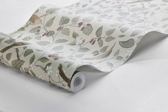 The matte non-woven wallpaper Sångfåglar is available in two color combinations. It shows a subtle pattern of songbirds and butterflies amidst mulberry branches and orange blossoms. Created by designer Sissa Sundling using watercolour and chalk colours, the wallpaper will add depth to your walls.