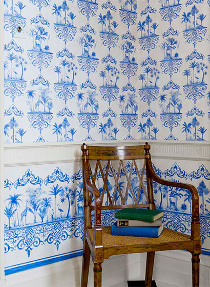 Rousseau is composed of elegant "cartouches" depicting drawn scenes of exotic palm trees and animals on a finely-craquelized background. Inspired by 18th and 19th century porcelain and tableware, Rousseau is available in five stunning colours: pink, dove grey, charcoal, olive and cobalt blue.