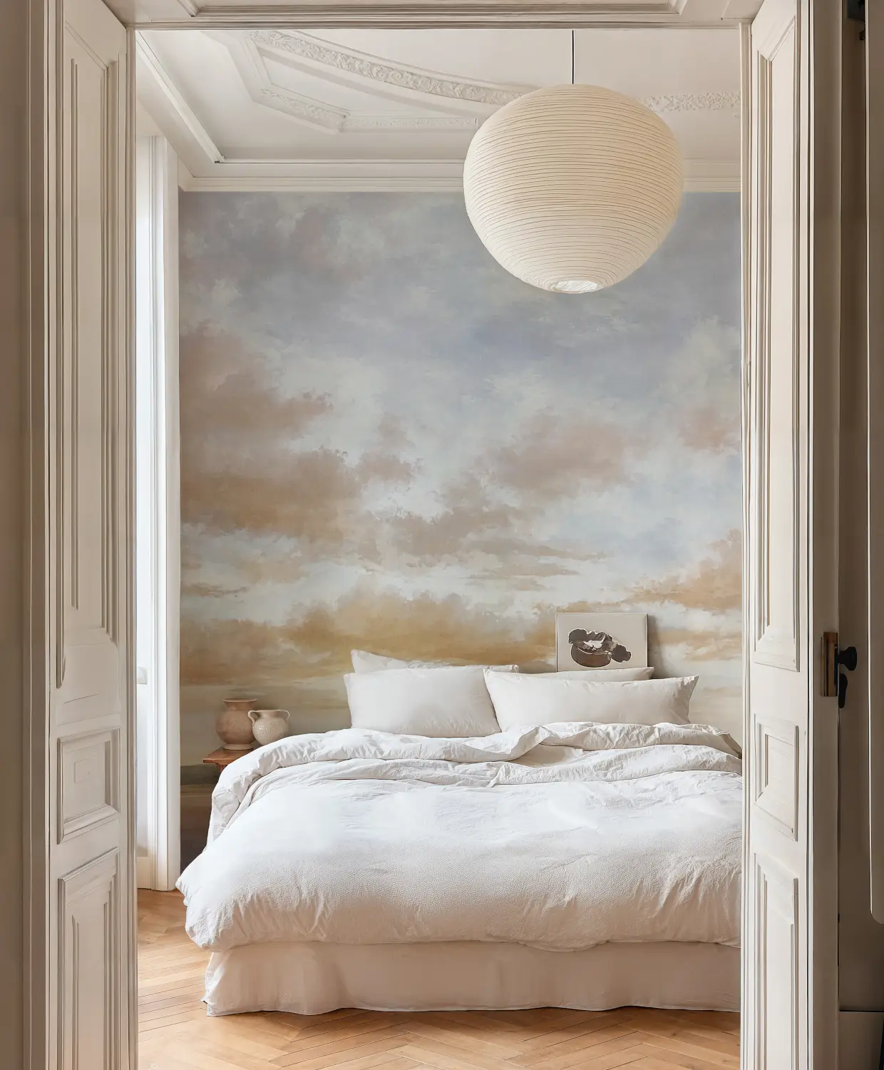 The panoramic wallpaper shows an expansive depiction of the sky with gently merging cloud formations. The beauty of a sky covered in lush, irregular shapes. The light, airy design opens up the room visually and conveys a calm, relaxing atmosphere.