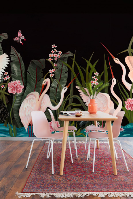 The Spanish designer Laura Torroba Lara Costafreda has implemented the motif of a striking pond landscape with storks in bright colors. There is a choice of a dark and a pastel background.