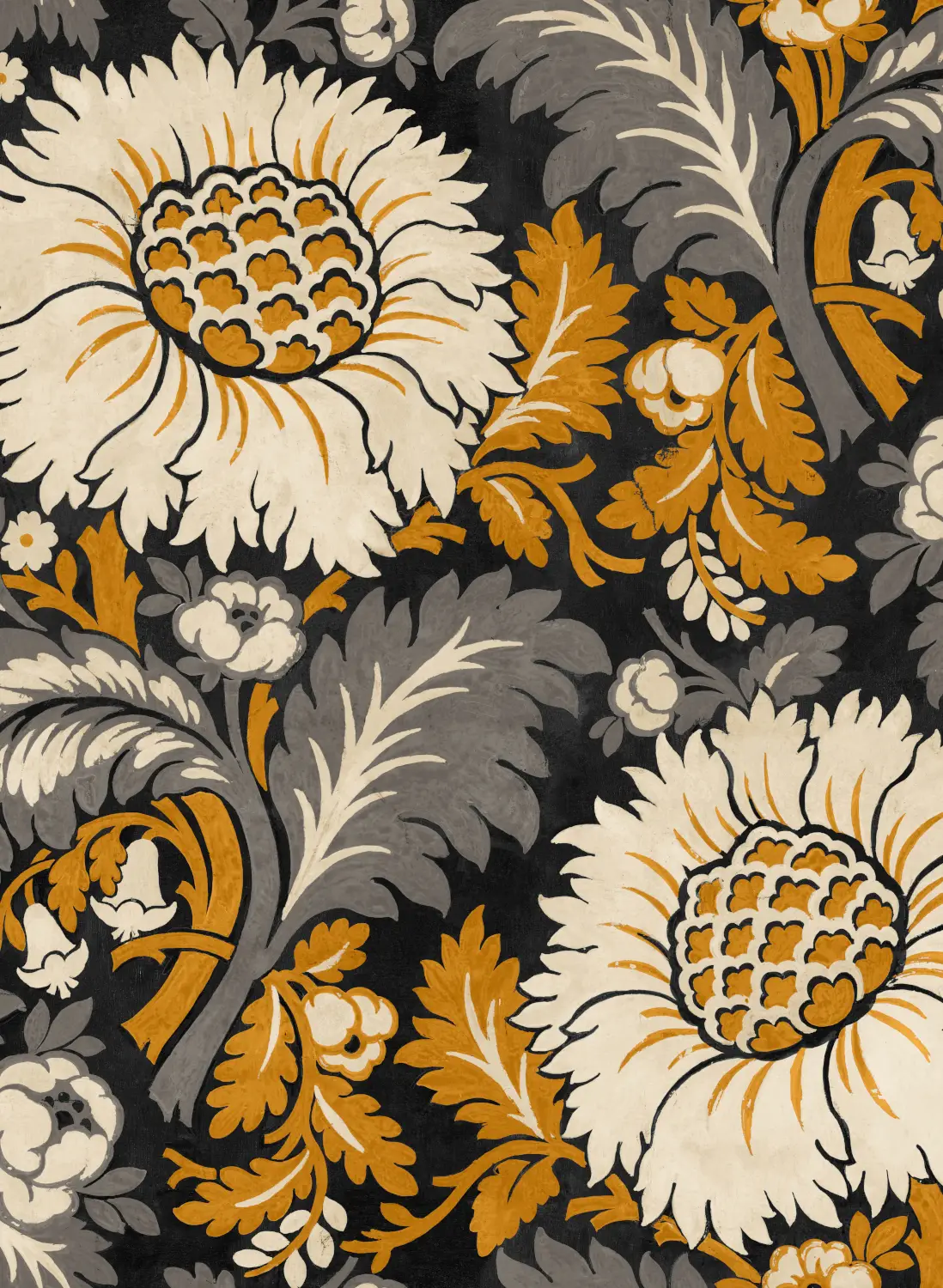 The wallpaper features a richly decorated floral pattern with curved shapes and balanced proportions. The large-scale colourful pattern is inspired by damask fabrics and is reminiscent of exotic Chinese-style sunflowers adorning delicate porcelain pieces. The combination of colour tones gives the room depth and creates a magnificently elegant atmosphere.