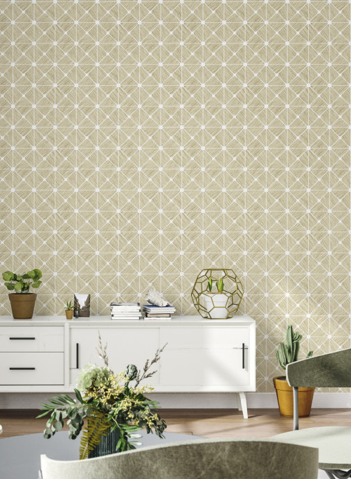 The wallpaper features a fabric made from natural fibres. Graphically divided into triangles with rounded corners, it creates an interesting geometric vintage pattern. The surface gives a realistic visual impression of the natural material, but thanks to the robust vinyl, it can also be used in areas subject to heavy wear.