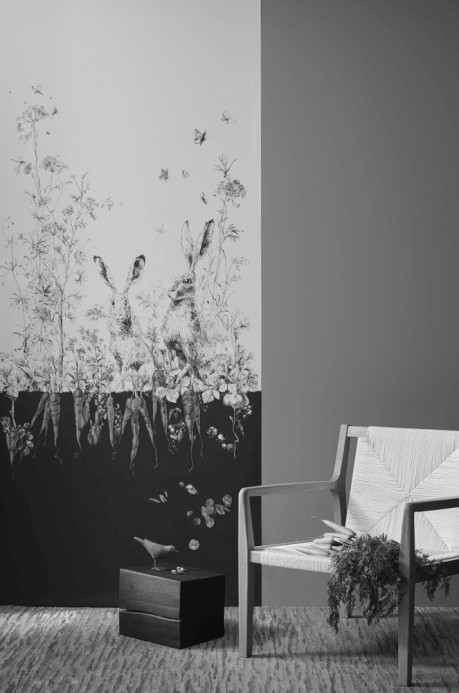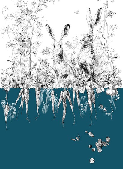 Lièvres/Fenouil/Tournesol - Bleu - wallpaper with rabbits and carrots by Edmond Petit, smooth non-woven wallpaper