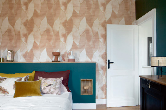 Through their clearly delimited segments, which alternate in but tone in tone as in silk painting, the matte vinyl wallpaper reminds of an abstract tapestry of leaves. At the edges the colors run out slightly, so that together with the linen optics an aesthetic room experience with echoes of 1970s designs results.