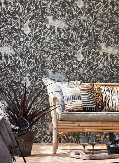 In this matte non-woven wallpaper, a leopard rests on tropical floral elements. He is flanked by a chameleon and a lemur. The metallic finish of the silver tones in all colour variants provides a fine mixture of matt and glossy elements.