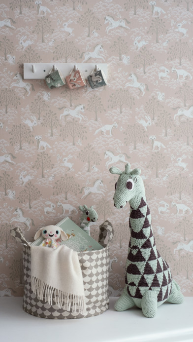 The Swedish children's wallpaper features an enchanting pattern with the animals of a fairytale forest. The design creates a typical Scandinavian fantasy world and invites you to dream.