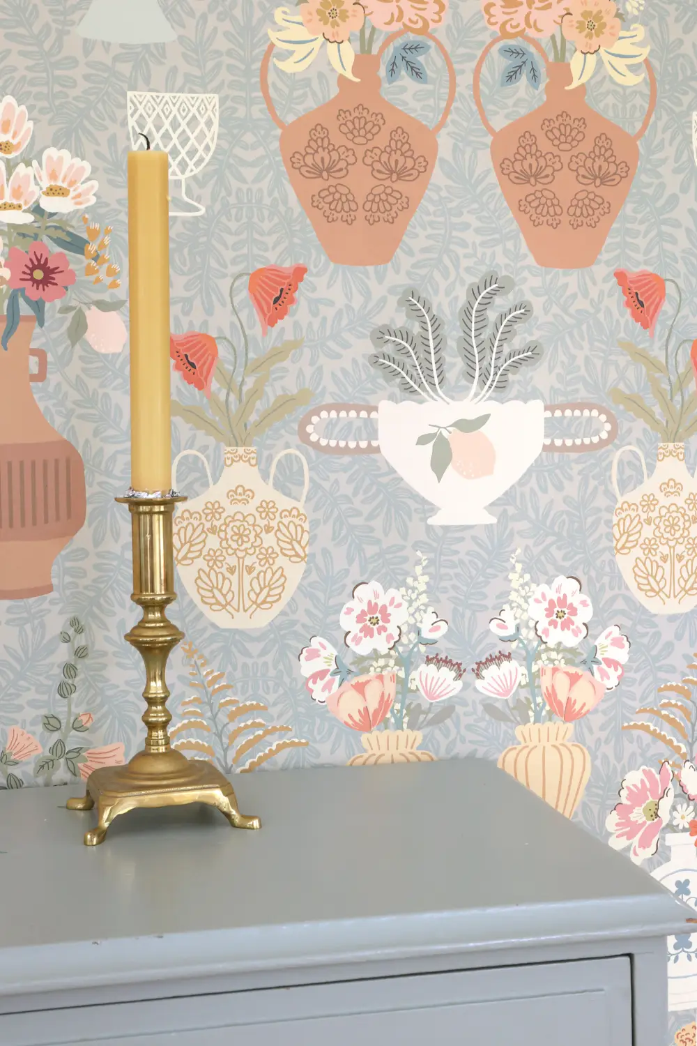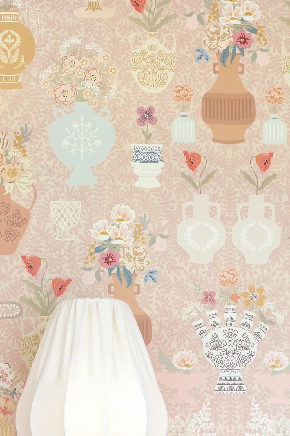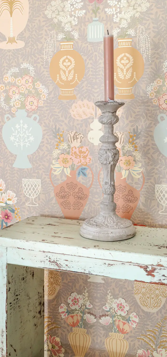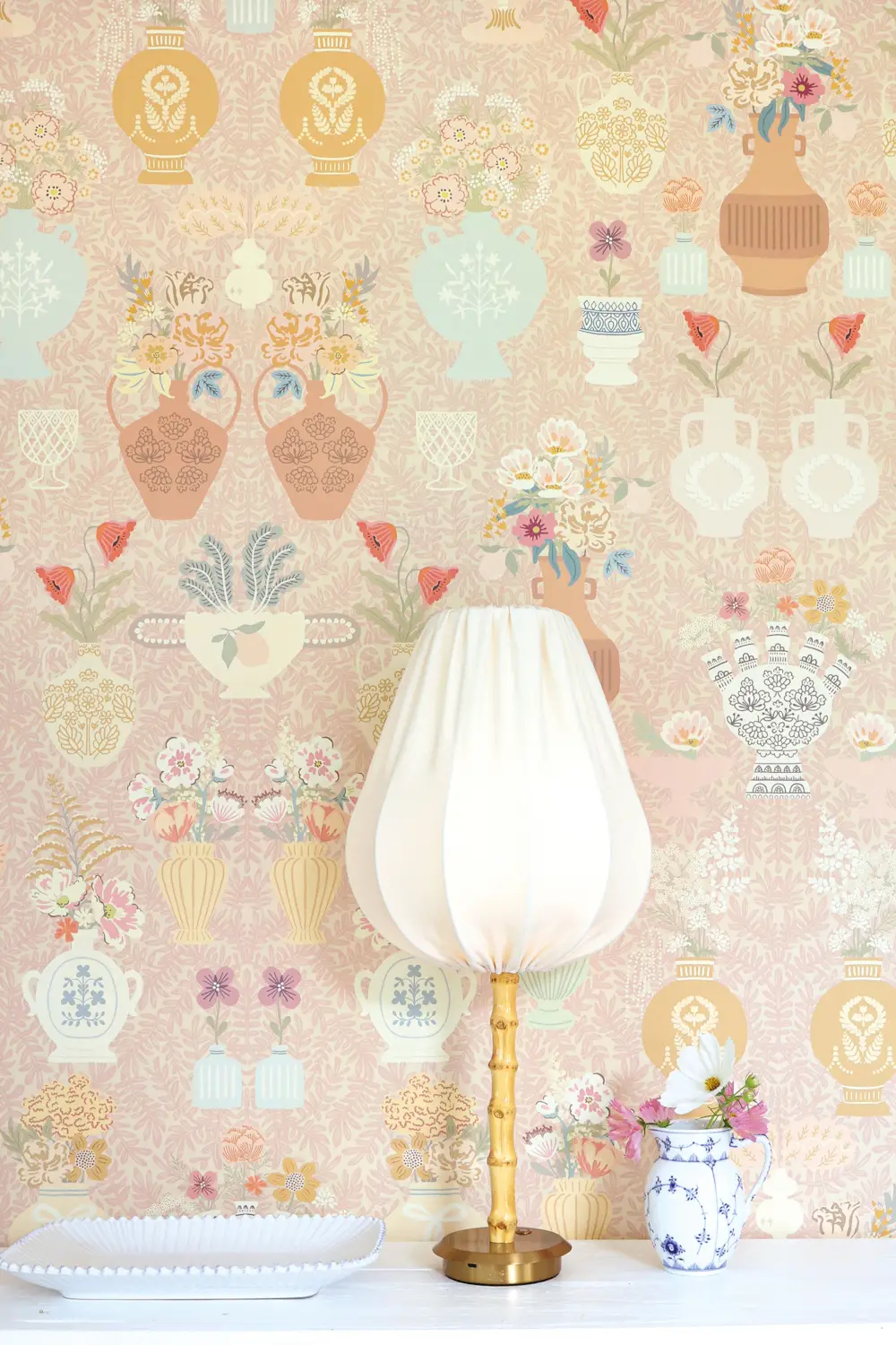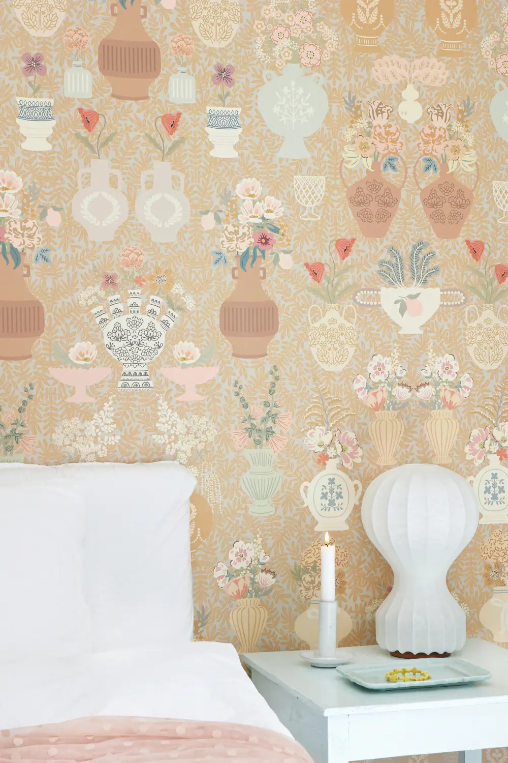 The wallpaper features a harmonious pattern of lush flower vases, enlivened by fine lines and bright colours. Together with its typical Swedish vintage colour scheme, it lends the room a fresh, summery look and feels elegant and playful at the same time.