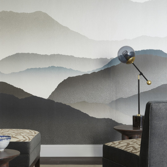 The mural is inspired by traditional Japanese prints. The pattern is reminiscent of a mountain range, clouds or colored waves. The motif is printed on a slightly iridescent mica background, which provides a fine crackle effect in the style of Japanese raku ceramics.