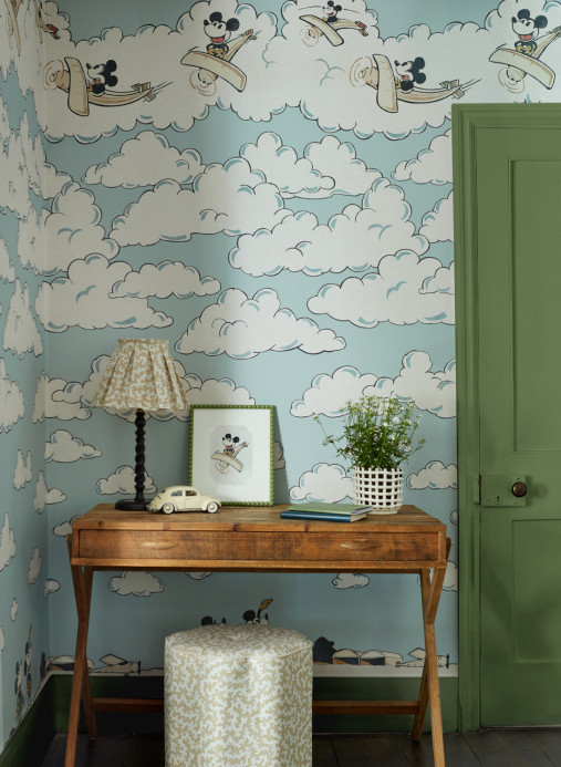 The wallpaper shows Walt Disney's Mickey Mouse high up in the clouds. The aeroplane motif was first produced by Sanderson in 1930 and was part of a decorative border. For the new edition, it has been combined with other Disney design elements to create a larger pattern. It is characterised by an enchanting vintage aesthetic.