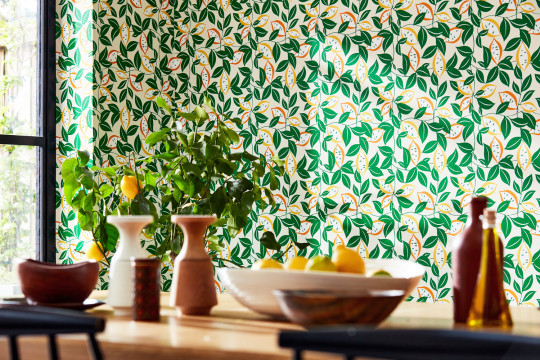Spicy fruits set refreshing colourful accents on this decorative trellis motif, which appears almost geometric.