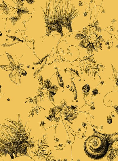 Ce design nous entraîne dans les mystères du jardin. Les hérissons, escargots, papillons et petits pois dessinés par Catherine Gran donnent un cachet tout particulier au salon, à la salle à manger et à la cuisine.