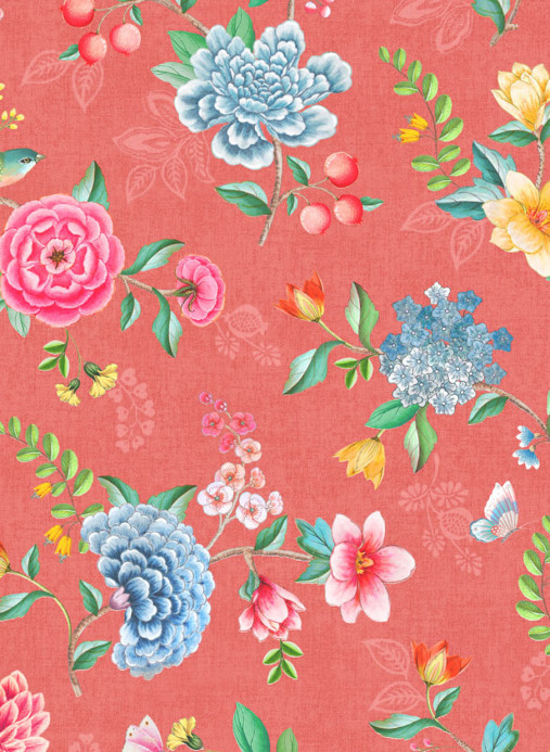 Le motif floral coloré de ce papier peint vinyle mat avec des oiseaux tropicaux s'inspire des peintures murales orientales traditionnelles.