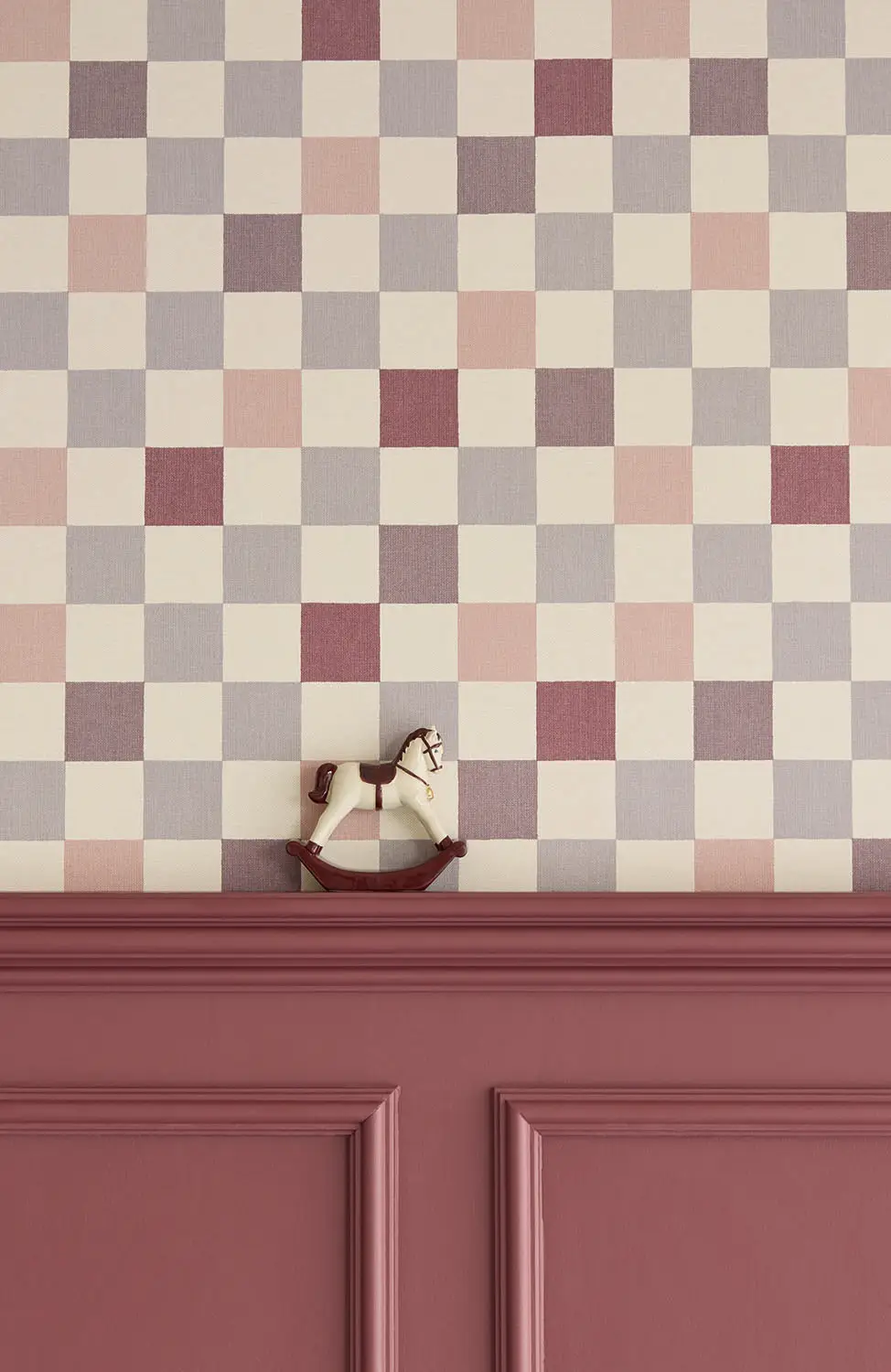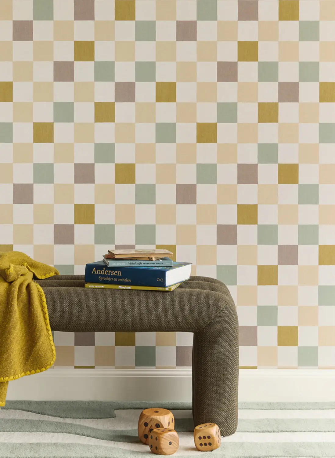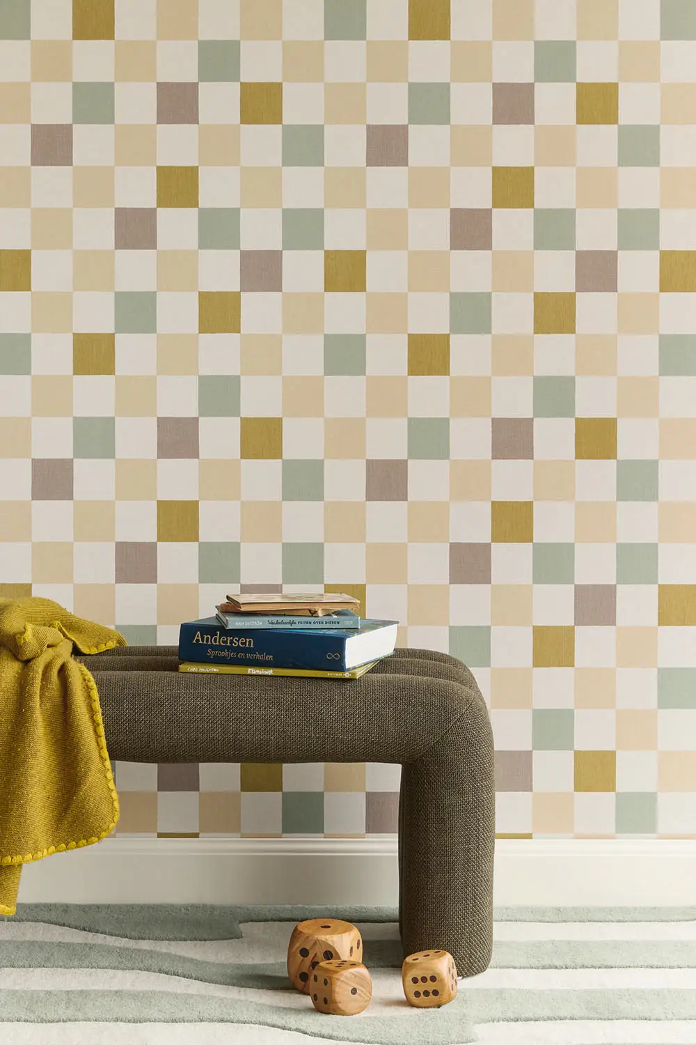 Le papier peint présente un doux motif à carreaux dans des tons dégradés. La répétition tranquille assure un effet équilibré et crée un effet agréable et harmonieux dans la pièce.