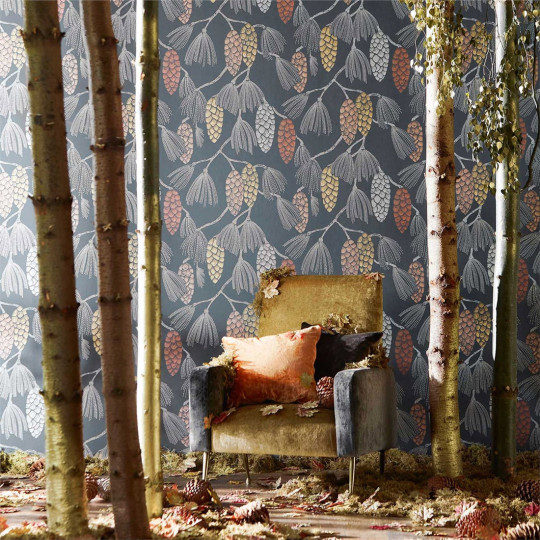 Un papier peint botanique représente des pommes de pin, des aiguilles de sapin et des branches. Ce papier peint à l'aspect merveilleusement vintage fait partie depuis de nombreuses années des best-sellers de la marque anglaise Harlequin. Le fond mat monochrome lui confère un aspect intemporel.