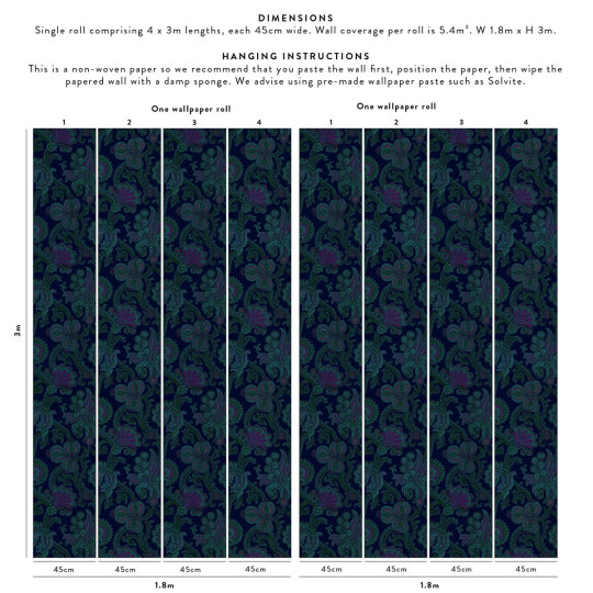 Le motif se compose de quatre lés (de 0,45 m x 3,00 m) et est extensible à l'infini comme un papier peint. Le support est un intissé de haute qualité, ce qui rend la pose très facile. Le mur est encollé et les lés sont posés directement sur le mur.