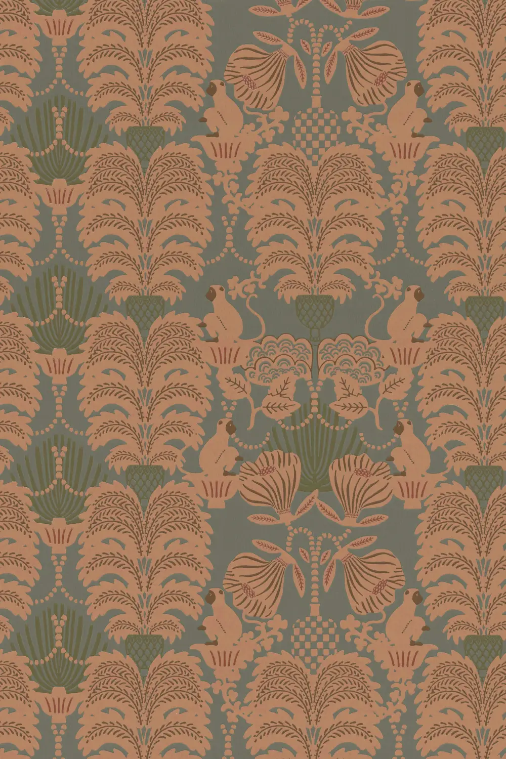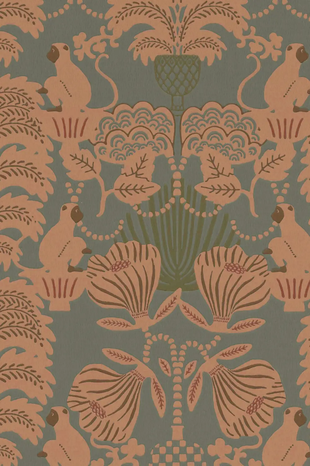 Le papier peint présente un motif fantaisiste avec des singes, des éléments floraux et des palmiers. Les couleurs harmonieuses de ce papier peint vintage typiquement suédois créent une atmosphère vivante et exotique qui remplit chaque pièce d'une chaleur ludique.