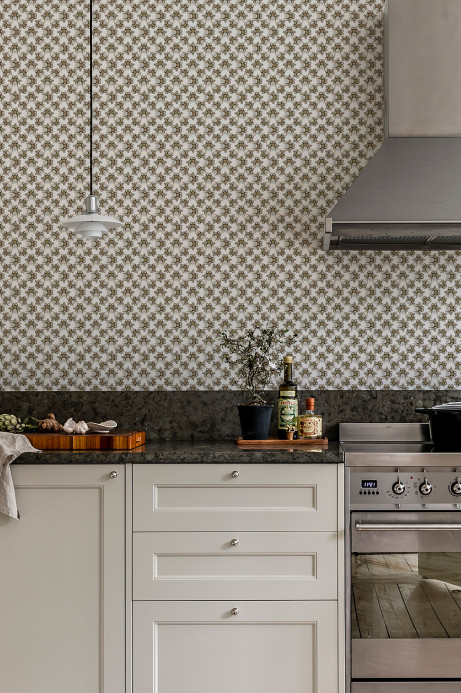 Le papier peint présente un design luxueux de petites mouches qui rappellent les losanges. La disposition dense et géométrique du motif crée une structure ordonnée sur le mur. Le motif raffiné confère un style élégant à la pièce et met l'accent sur la cuisine et le salon.