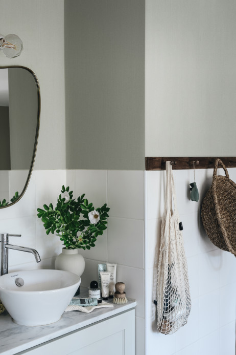 Le papier peint possède une surface légèrement structurée qui rappelle le lin tissé. Son aspect mat lui confère un caractère doux.