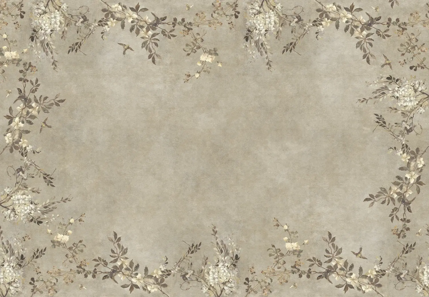 Ce papier peint panoramique présente un motif équilibré de fleurs et de feuilles délicates, aux couleurs douces, qui forment un cadre harmonieux autour d'un centre paisible. Ce papier peint panoramique entoure la pièce de délicates branches de fleurs et d'oiseaux enjoués, créant ainsi un fond naturel apaisant.