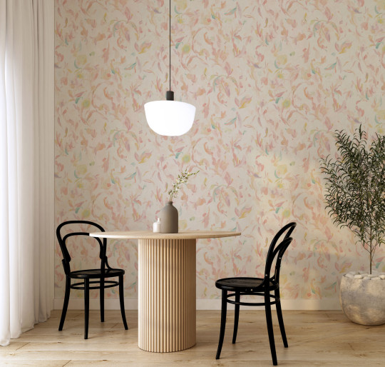 Le papier peint présente un motif de fleurs abstraites aquarellées. Les fleurs et les feuilles donnent l'impression d'avoir été peintes directement sur le mur. Le motif capture l'essence des fleurs et crée une dynamique sur le mur.