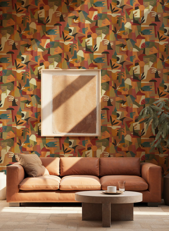 Le papier peint présente un motif aéré de formes géométriques librement disposées dans des couleurs contrastées. La disposition irrégulière crée un effet énergique et moderne dans la pièce.