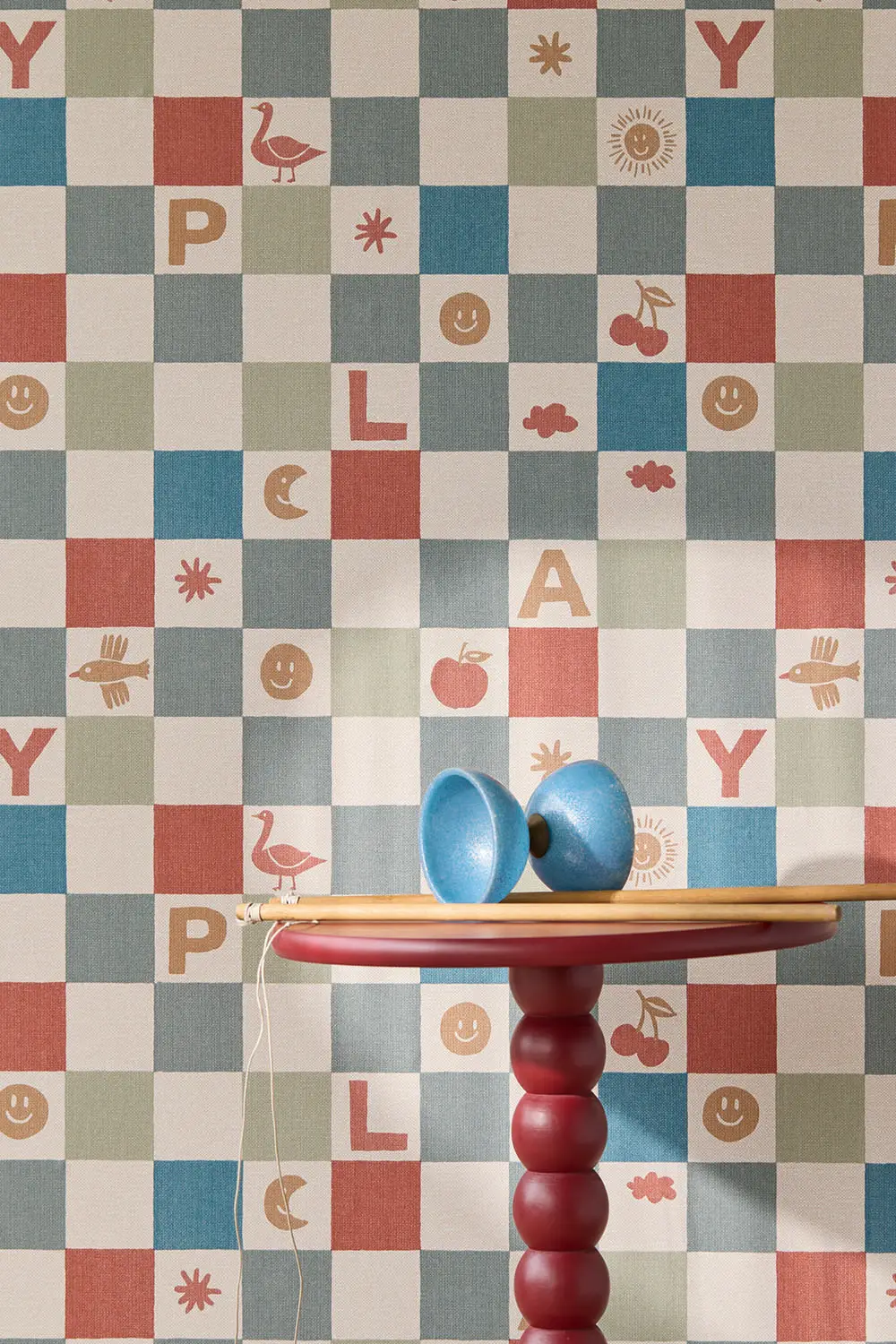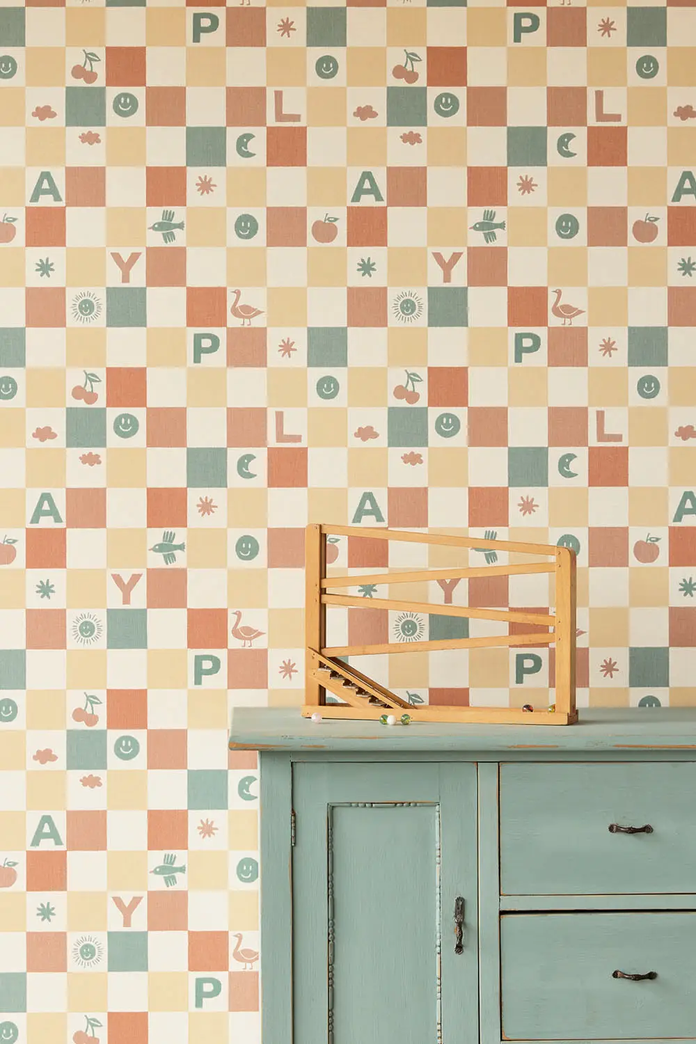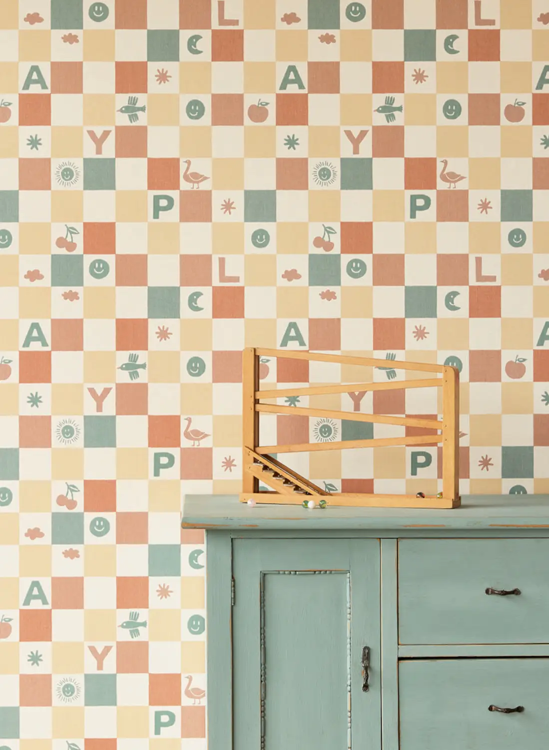La carta da parati presenta un motivo a scacchiera con piccoli simboli e forme sparsi. La struttura chiara combinata con dettagli giocosi conferisce leggerezza e un'atmosfera amichevole alla stanza.