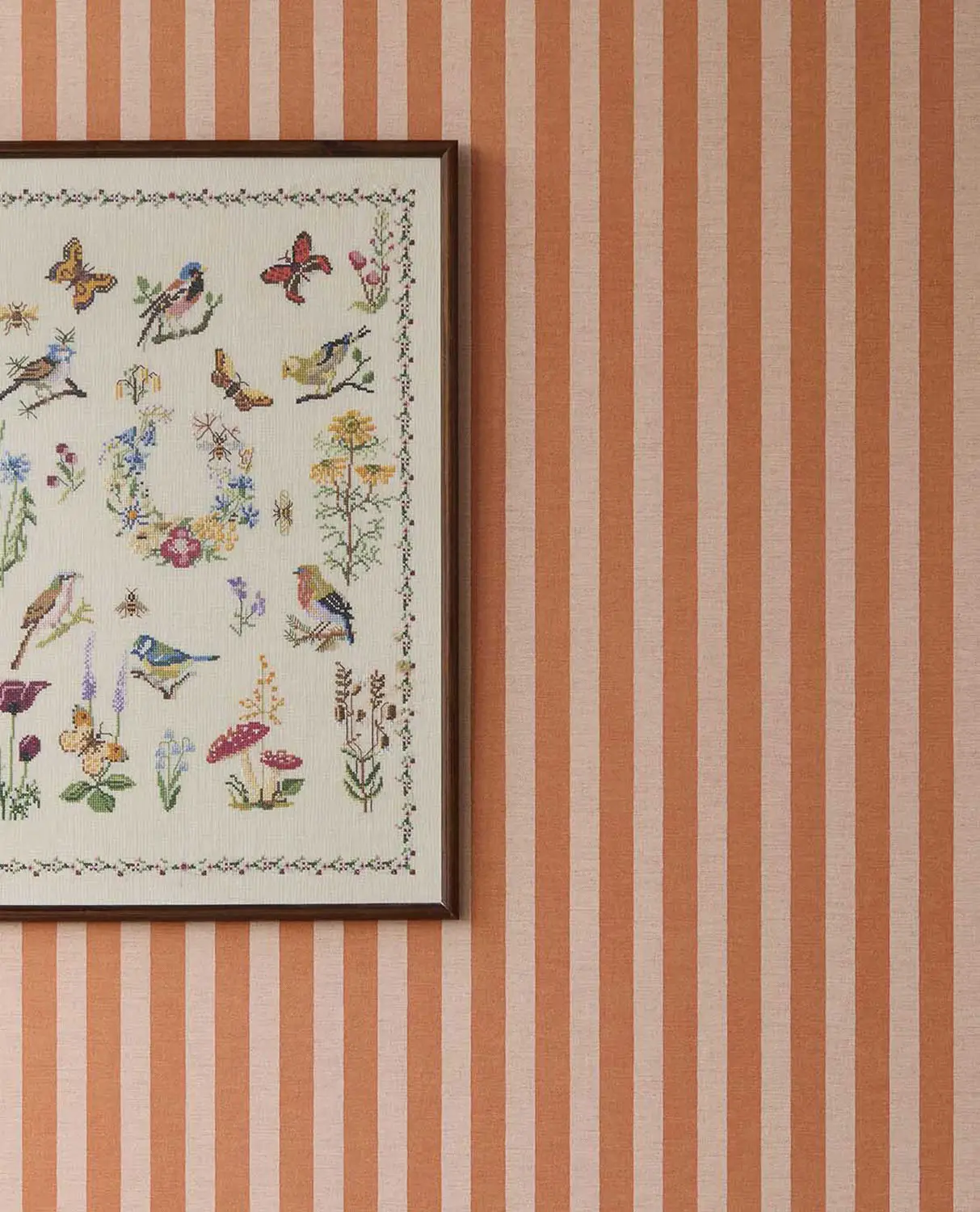 La carta da parati presenta un motivo a righe regolari in tonalità tenui. L'allineamento verticale allunga visivamente la stanza e le conferisce una struttura chiara e senza tempo.