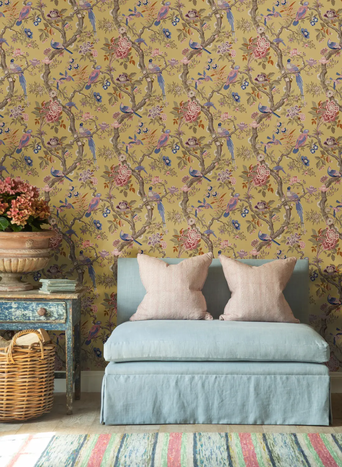 La carta da parati presenta un motivo dettagliato di rami fioriti e uccelli, distribuiti liberamente sulla superficie. La disposizione equilibrata ha un effetto vivace ma tranquillo e conferisce all'ambiente un'atmosfera elegante e classica.