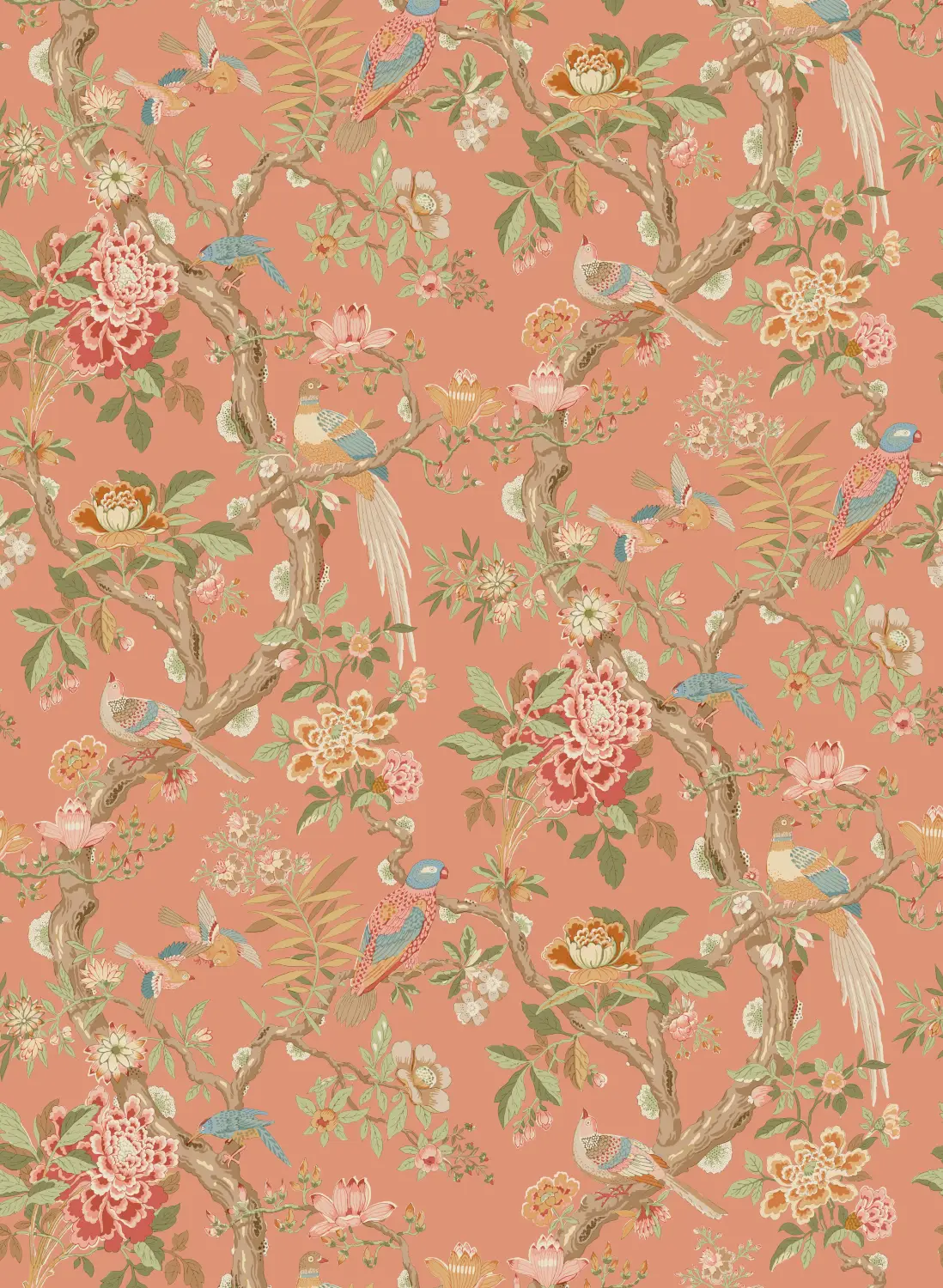 La carta da parati presenta un motivo dettagliato di rami fioriti e uccelli, distribuiti liberamente sulla superficie. La disposizione equilibrata ha un effetto vivace ma tranquillo e conferisce all'ambiente un'atmosfera elegante e classica.