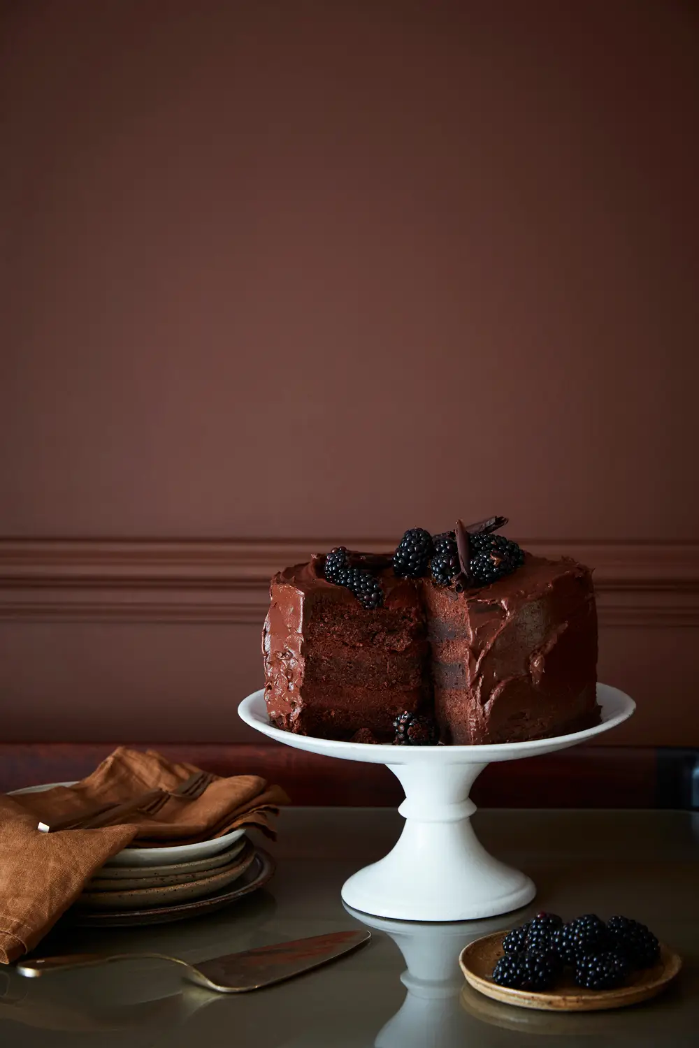 Ganache 345 - In der französischen Folklore wurde das Wort Ganache ursprünglich von einem wütenden Chefkoch im Paris der 1920er Jahre als Beleidigung geprägt. Das Ergebnis war die Mischung aus reichhaltiger Schokolade und heißer Sahne, die in den Konditoreien von heute eine so große Rolle spielt. Als Farbton wurde er als eine von mehreren Farben in einer kunstvoll bemalten Decke in Blickling Hall in Norfolk entdeckt, die Anfang des 20. Jahrhunderts mit Brettern vernagelt und nach einer Überschwemmung fast hundert Jahre später wiederentdeckt wurde. Mit seiner beneidenswerten Tiefe ist Ganache wahrscheinlich der dunkelste Farbton in Ihrem Raumkonzept, aber Sie können ihn auch mit dem noch dunkleren Chocolate Colour kombinieren, um ein engagiertes Einrichtungsstatement zu setzen.