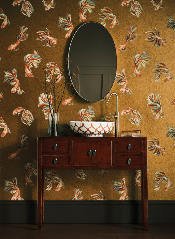 La carta da parati floreale è stata ispirata da una carta da parati scoperta sulle pareti della cucina di una tenuta di campagna della Transilvania del XV secolo. Il motivo, realizzato come disegno hold-print, mostra foglie e boccioli intrecciati su uno sfondo colorato.