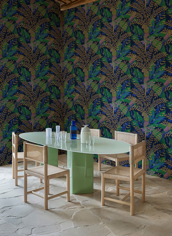 La carta da parati è costituita da intarsi in sisal con sottili arabeschi, il cui effetto è enfatizzato dall'orientamento delle fibre marmorizzate. Un gioco grafico che enfatizza la bellezza del materiale naturale. La struttura raffinata crea una dinamica sottile e conferisce all'ambiente una profondità calma ed elegante.