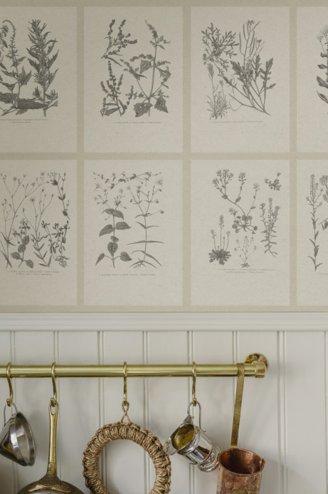 La carta da parati panoramica presenta fiori piastrellati ispirati a illustrazioni botaniche storiche. Il motivo dettagliato porta in casa la bellezza di un giardino fiorito.